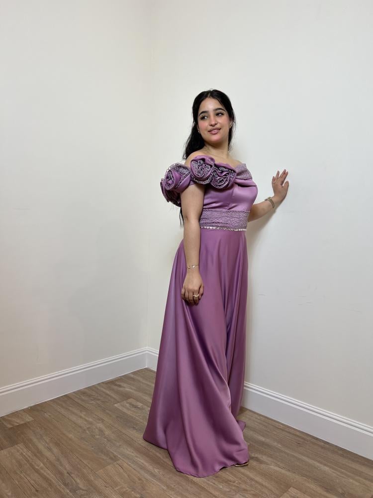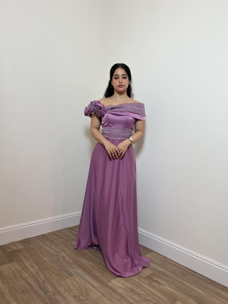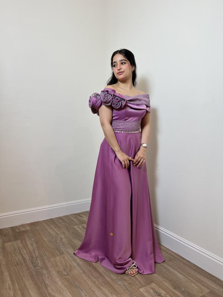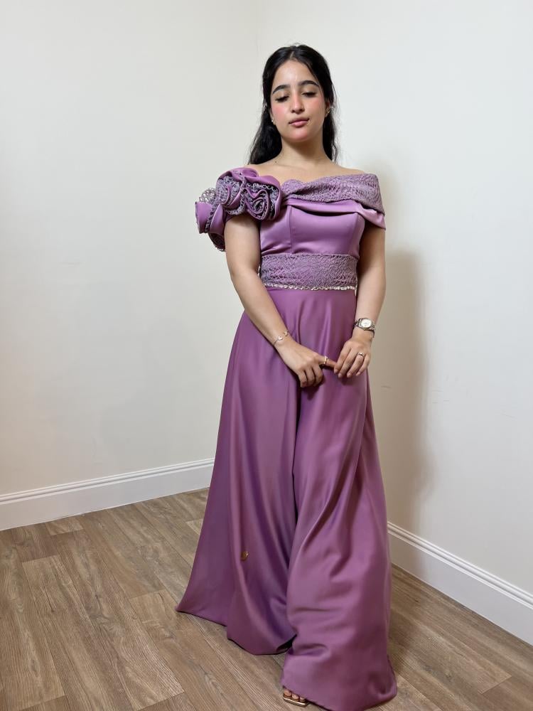 تزيّن الكتفين تفاصيل وردية راقية تضيف لمسة فنية رومانسية تعبّر عن الذوق الرفيع. اللون الموف يعكس الفخامة والغموض بجاذبية هادئة تناسب أرقى المناسبات.